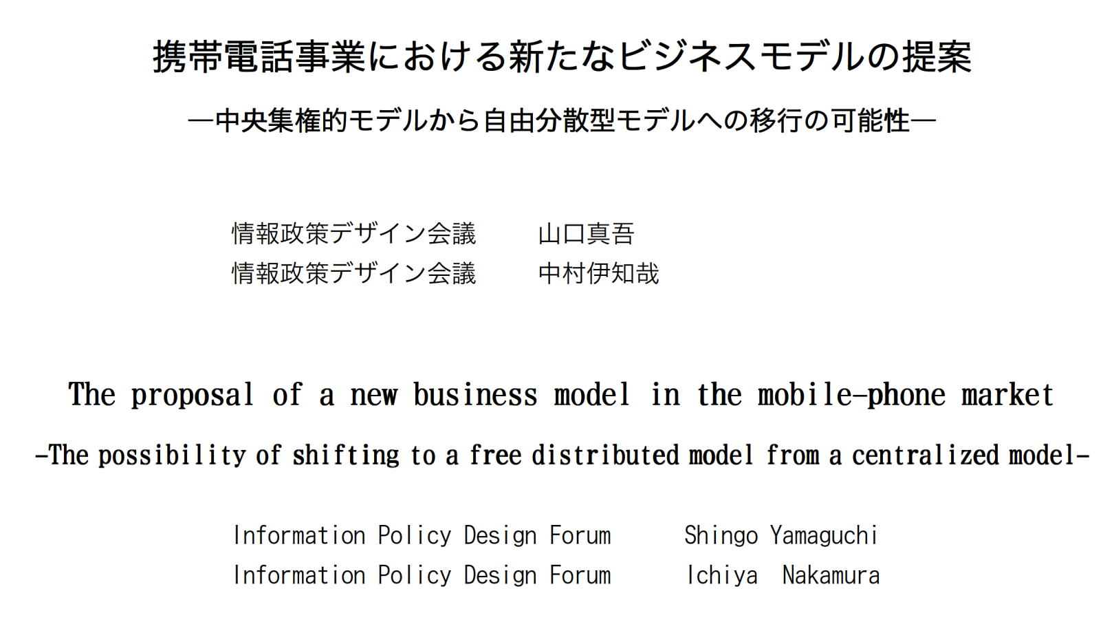 携帯電話事業における新たなビジネスモデルの提案 2002年12月31日2016年7月25日 投稿者: bizmodelorg 携帯電話事業における新たなビジネスモデルの提案 ―中央集権的モデルから自由分散型モデルへの移行の可能性― 情報政策デザイン会議 山口 真吾 情報政策デザイン会議 中村 伊知哉 Vol1-2 共有: クリックして X で共有 (新しいウィンドウで開きます) X Facebook で共有するにはクリックしてください (新しいウィンドウで開きます) Facebook いいね 読み込み中… bizmodelorg コメントを残す コメントをキャンセル Δ