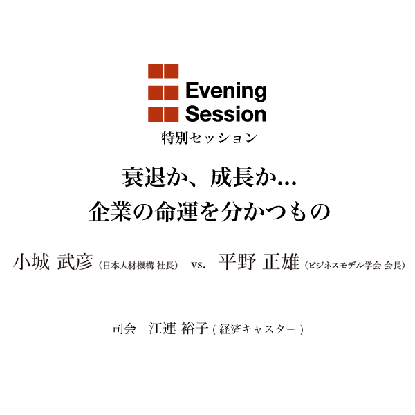 「 衰退の法則: 日本企業を蝕むサイレントキラーの正体 」 ( 東洋経済新報社 ) の著者であり、カネボウや丸善のトップとして企業変革の前線に立ち、その後東京大学大学院にて企業衰退プロセスの学術研究をされた小城武彦さん ( 現 日本人材機構代表取締役社長 ) と、「 経営の針路 」 ( ダイヤモンド社 ) の著者であり、ビジネスモデル学会の会長である平野正雄がパネラーとなる特別セッションを開催します。